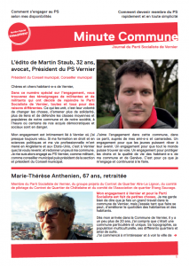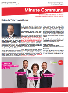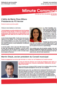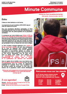 La Minute Commune est le journal du Parti Socialiste de Vernier. Il paraît plusieurs fois par année et est distribué dans toutes les boîtes aux lettres de notre ville. Vous y trouvez notamment les principales informations et positions prises par le Parti Socialiste à Vernier.